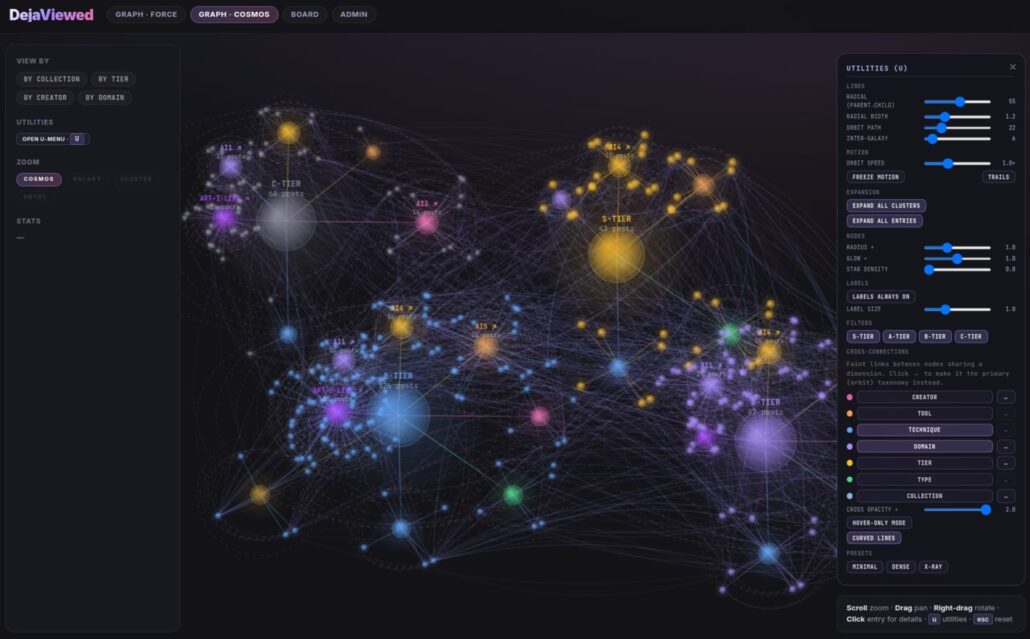 The force-directed graph maps every entry as a node connected to its tools, techniques, creators, and collections. You can filter by node type, toggle taxonomies (by tier, collection, creator, tool, technique), and overlay cross-connections — faint ghost lines between entries that share a dimension. It’s built on D3.js with a full utilities panel for tweaking forces, link opacity, node sizes, and presets.